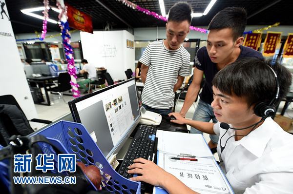2015年7月19日,在浙江義烏國際商貿城網商服務區,“聚寶網商”的企業員工為新注冊電商企業提供產品銷售運行服務。2015年上半年,義烏市新增電商企業6869家,同比增長23%;電子商務實現交易額618億元,同比增長31%。新華社發(龔獻明 攝)