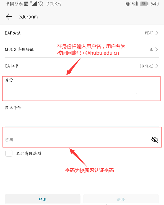 我校師生在訪問eduroam聯盟的高校或學術組織時,用戶名為:學號或工號+@hubu.edu.cn(認證時請務必添加“@hubu.edu.cn”后綴,否則將不能正常使用,例如:20040000@hubu.edu.cn)。密碼為:校園網認證密碼(請妥善保管,切勿外傳)。