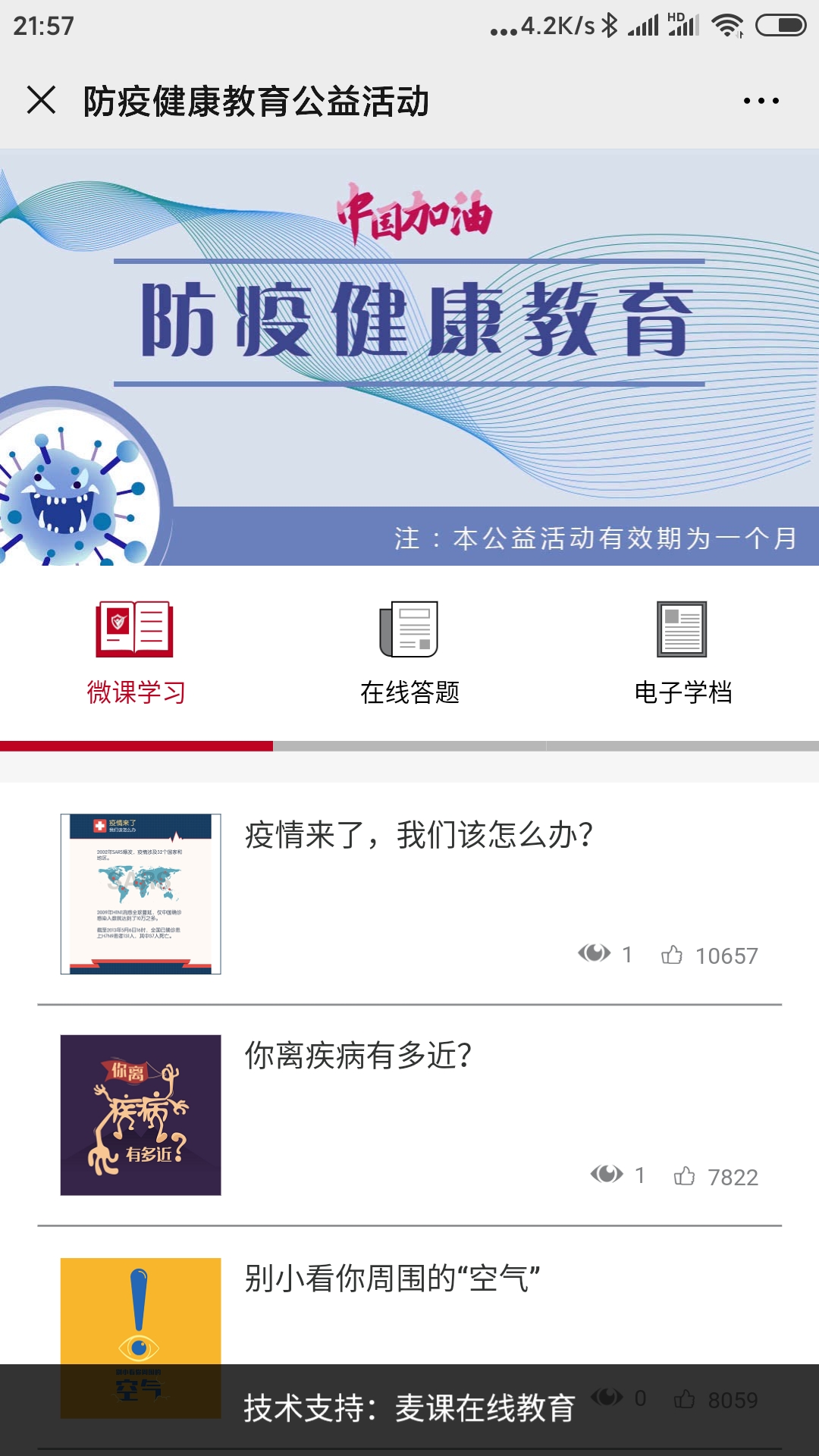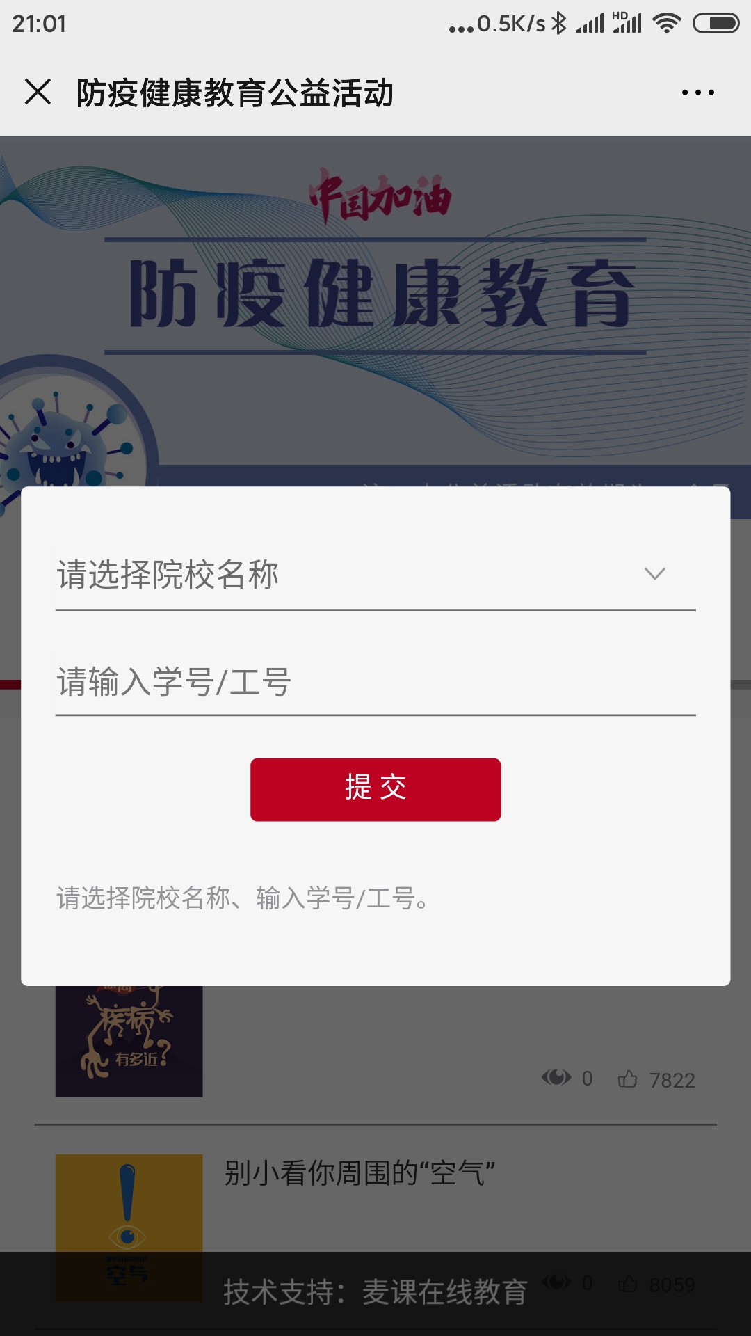 通過以上兩種方式登陸后,輸入學校名稱和學號,便可開始防疫健康相關課程的學習,完成17門課程的學習可進入測試。