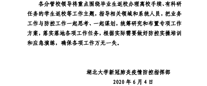 來源:湖北大學疫情防控指揮部 作者: 編輯:鮮文濤 時間:2020-06-05 字號: 【大】 【中】 【小】