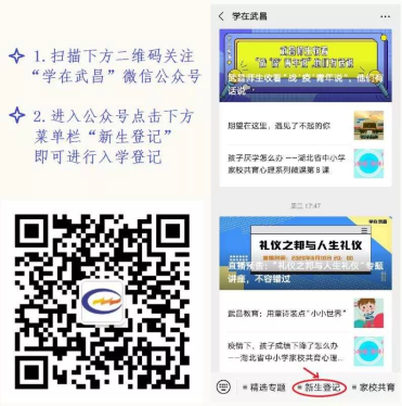 為方便各位家長辦理入學(xué)登記,“學(xué)在武昌”微信公眾號上設(shè)置了“新生登記”菜單欄,家長可以通過關(guān)注微信公眾號登記信息,具體操作如圖: