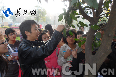 而讓同學們最感興趣的是該校9棟宿舍樓旁的木繡球(瓊花)和教育超市前的楓楊。吳明煜介紹,木繡球在該校僅存一株,每年四五月開花,花非常漂亮。楓楊則是湖北大學最古老的植物,屬于胡桃科,是武漢二級保護植物。