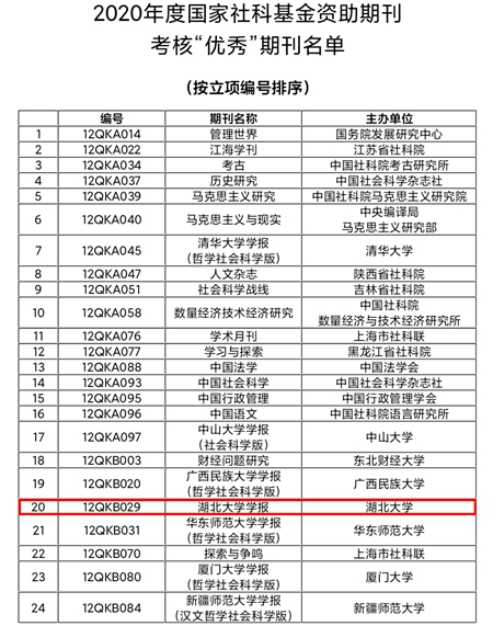 12月10日,全國(guó)哲學(xué)社會(huì)科學(xué)工作辦公室通報(bào)了2020年度國(guó)家社科基金資助期刊考核情況,《湖北大學(xué)學(xué)報(bào)》(哲學(xué)社會(huì)科學(xué)版)在考核中獲評(píng)優(yōu)秀。