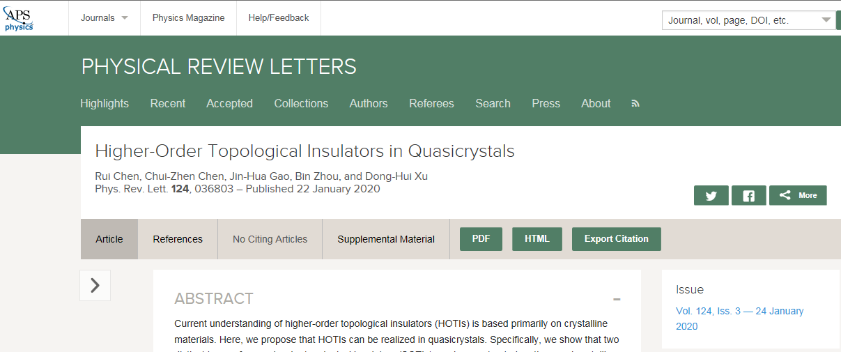 近日,物理學頂級期刊《物理評論快報》(Physical Review Letters)發表了我校物理與電子科學學院許東輝副教授、周斌教授關于高階拓撲絕緣體的重要原創工作,題目為 “Higher-Order Topological Insulators in Quasicrystals”(準晶中的高階拓撲絕緣體),湖北大學為論文第一和通訊單位,蘇州大學、華中科技大學為合作研究單位。周斌教授的博士生陳銳(現為南方科技大學博士后)為論文第一作者,許東輝副教授、周斌教授為論文共同通訊作者。本工作得到國家自然科學基金、楚天學者“楚天學子”計劃的支持。