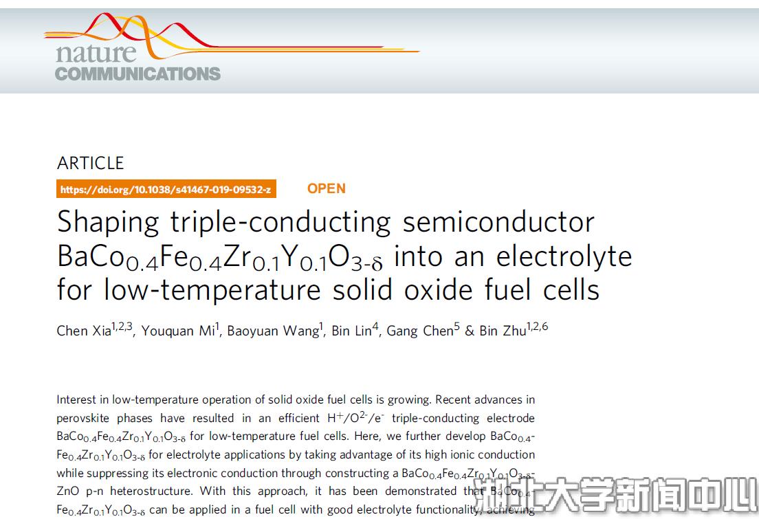 近日,我校物理與電子科學(xué)學(xué)院朱斌教授團(tuán)隊(duì)在低溫固體氧化物燃料電池電解質(zhì)方面取得突破性進(jìn)展,相關(guān)研究成果以“Shaping triple-conducting semiconductor BaCo0.4Fe0.4Zr0.1Y0.1O3-δ into an electrolyte for low-temperature solid oxide fuel cells”為題發(fā)表于國(guó)際著名期刊Nature Communications(Nature子刊,SCI影響因子12.353)。物電學(xué)院青年教師夏晨為論文的第一作者,朱斌教授和汪寶元副教授為共同通訊作者,湖北大學(xué)是該論文的第一完成單位和通訊單位。